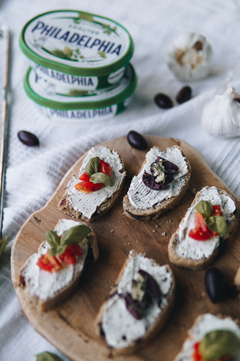 Zum Brot gab es natürlich den Philadelphia Frischkäse mit Kräutern, frische Tomaten, Oliven und Basilikum.