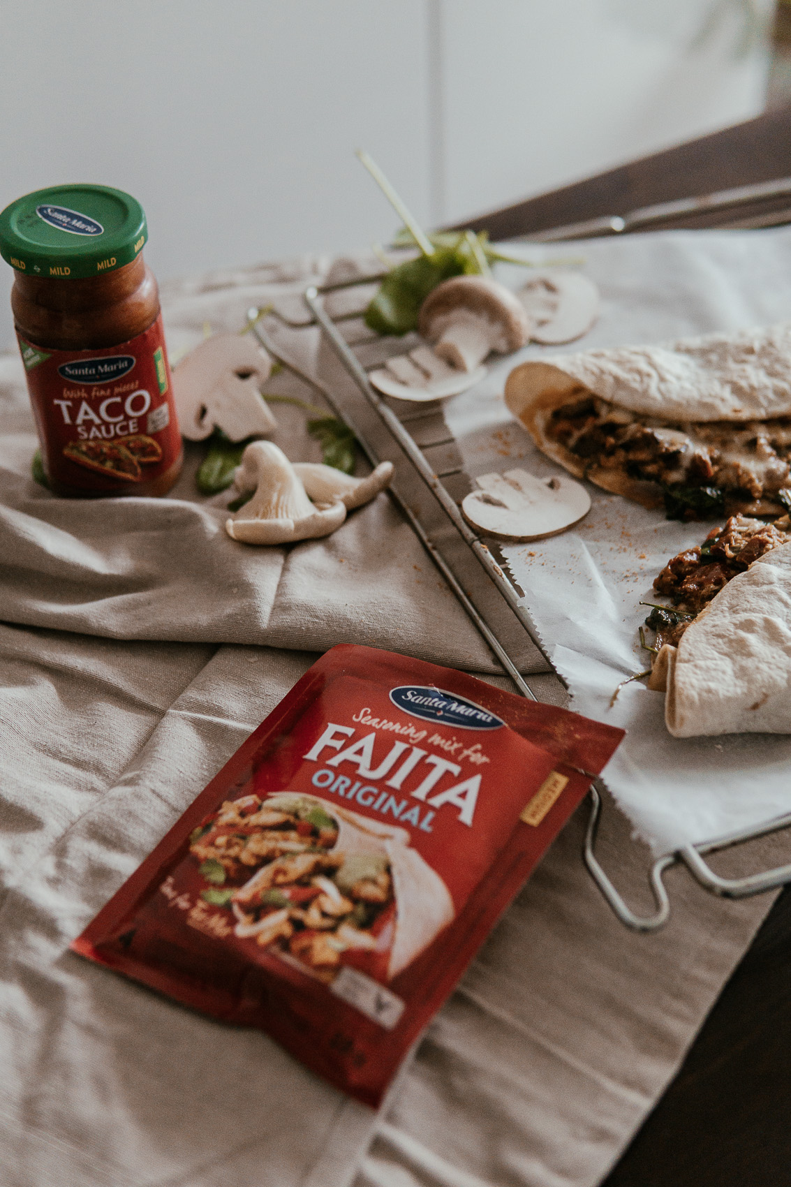 - Die Tortillas auf einem mit Backpapier ausgelegtem Blech platzieren und mit der Taco Sauce bestreichen.